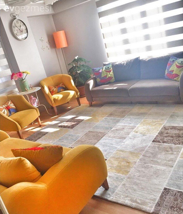 Güzel günlerde oturun. Salon ve mutfak halınızı ve holdeki renkli çekmeceli dolabı nereden aldınız acaba? Teşekkürler.