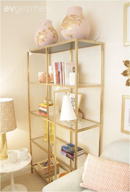 Ikea Vittsjö serisi, metal iskelet ve cam raflarıyla farklı şekillere girmeye çok açık. Kendi fiyatı da oldukça uygun olan bu seriyi, biraz sprey boyayla renklendirmek hem ucuz, hem de kolay..