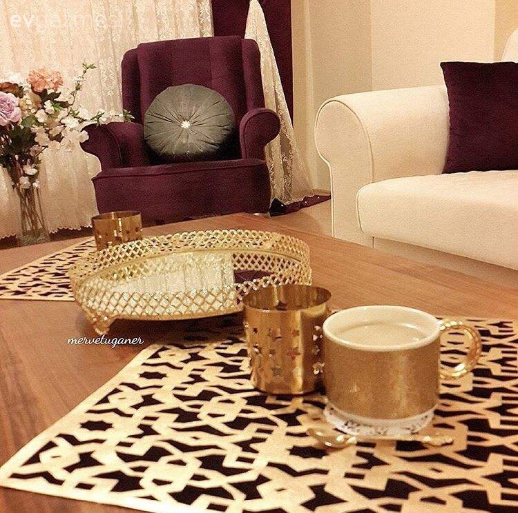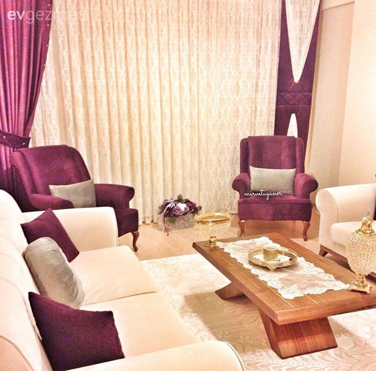 Bursa'da yaşayan Merve hanımın mor vurgulu salonu, altın dekoratif objelerle şık bir hava kazanmış..