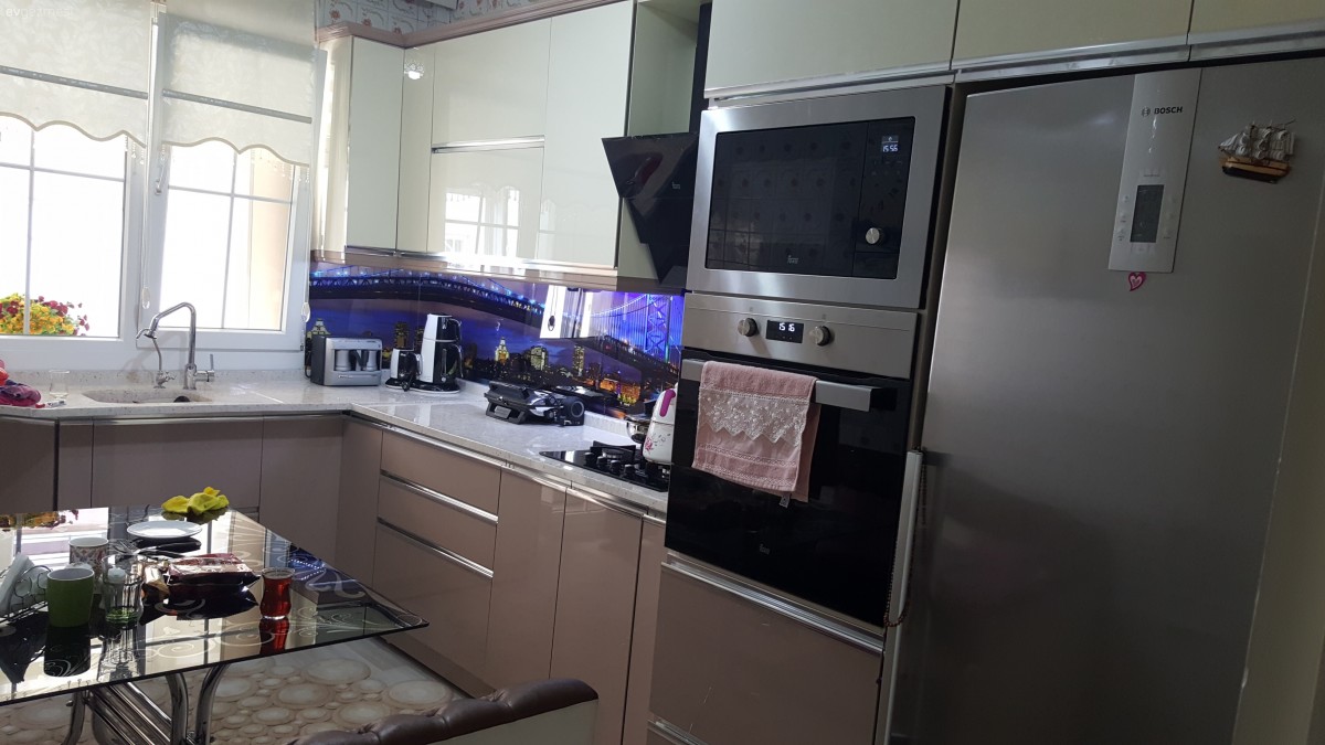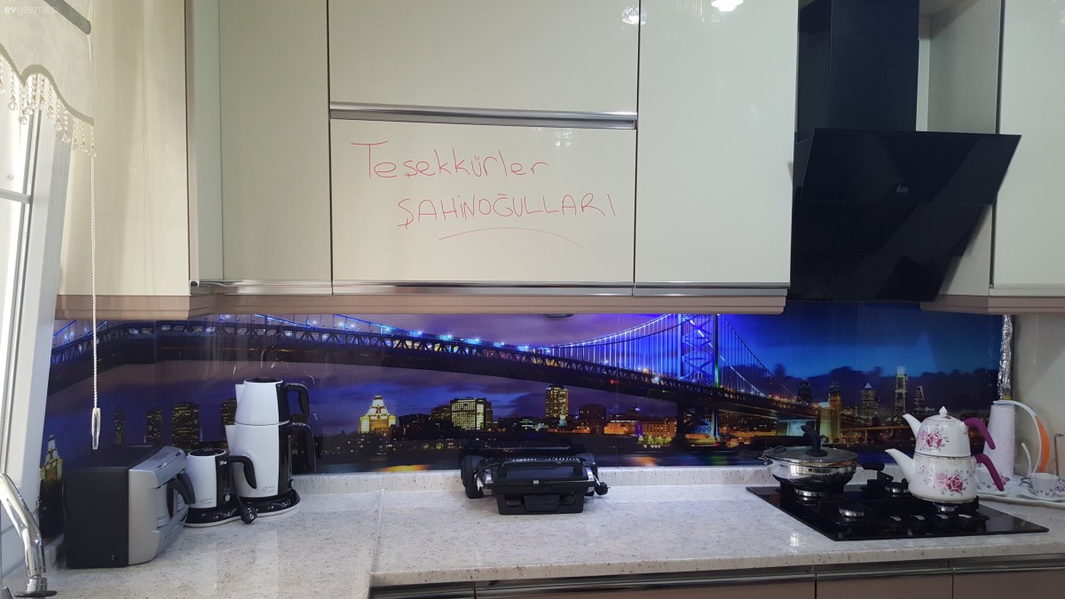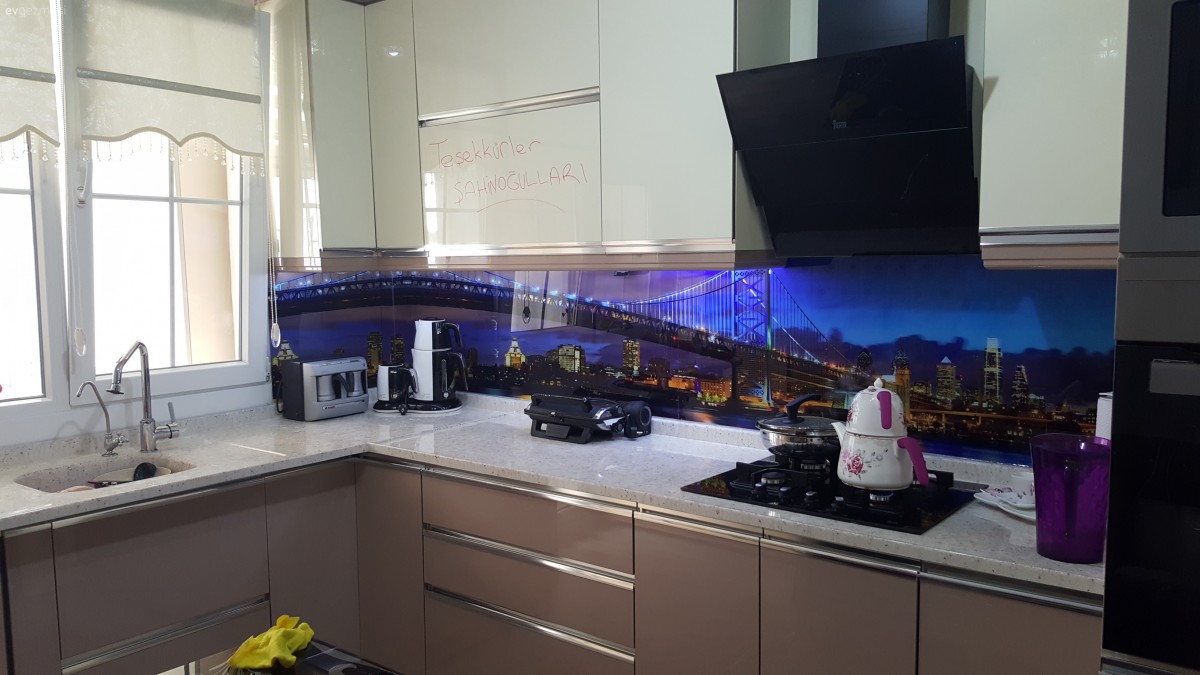 Dolaplariniz güzel ama ben bu desenli manzaralı camları mutfakta sevmiyorum çok karışık Dolaplariniz çok güzel ama o manzara bozmuş çok koyu kalmis