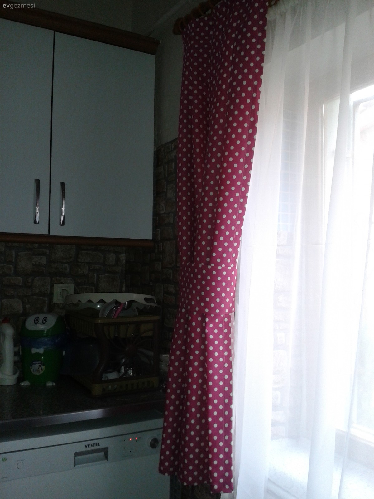 Dolap perde güzel olmuş ellerinize sağlık ancak o taş deseni tarzı ve rengi çok alakasız ve karanlık bir hava vermiş eski dolaplara taş desen daha çok uyardı. Dolapların rengi kaplaması çok güzel cıvıl cıvıl şirin br uygulama .
