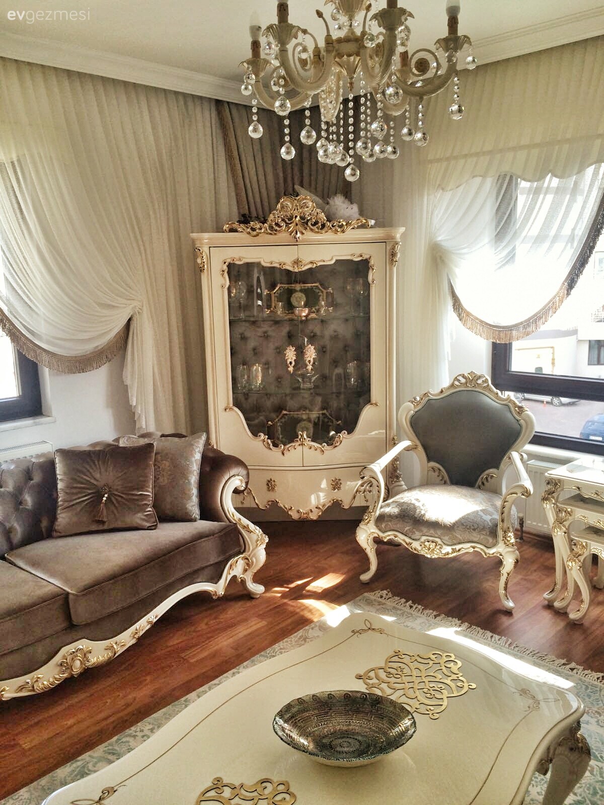 mobilyaların çok şık ve işlemeler var aynı zamanda halıda çok hareketli ama itiraf etmeliyim perdeler çok ağır kaçmış dahasade olmalıydı yeterince işlememe ve gösterişi olan salonunuzu göz yorucu ve kalabalık göstermiş mobilyalarınızı çok beğendim sağlıkla güle güle kullanın