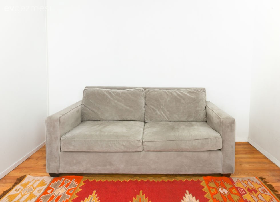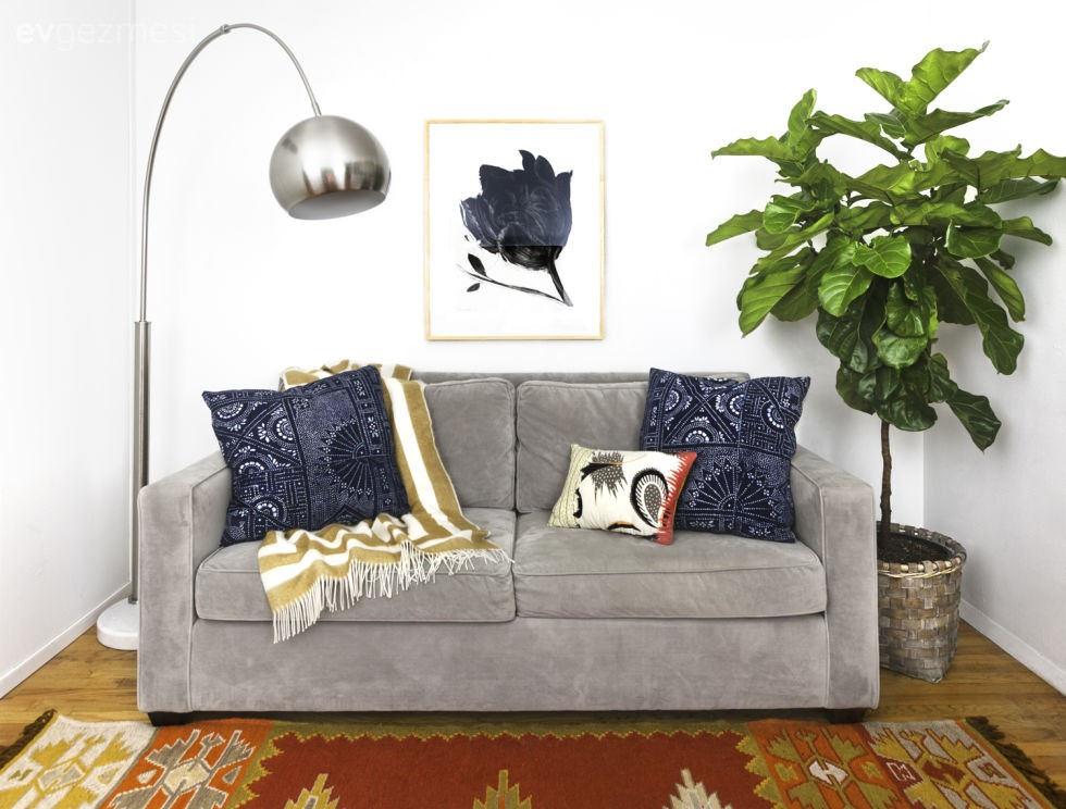 Halıyı değiştirin: Nötr renkli kanepeye biraz hareket katmak için sıcak renkte ve hareketli desenli bir halı tercih edilmiş..