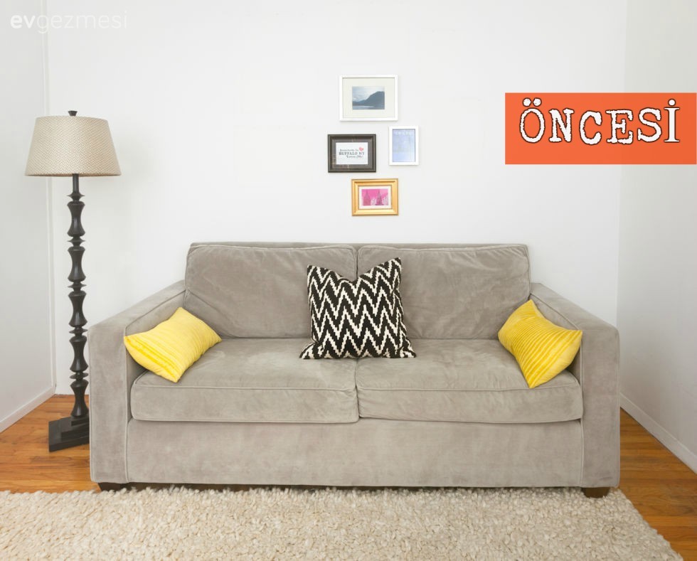 Elle Decor stilistleri, dekorunda problem olan bir duvar önü kanepeye küçük değişimlerle yeni bir hayat veriyor. Benzer bir şekilde, koltuk veya döşeme değişimi yapmadan alanın havasını değiştirmek isteyenlere güzel fikirler veriyorlar..