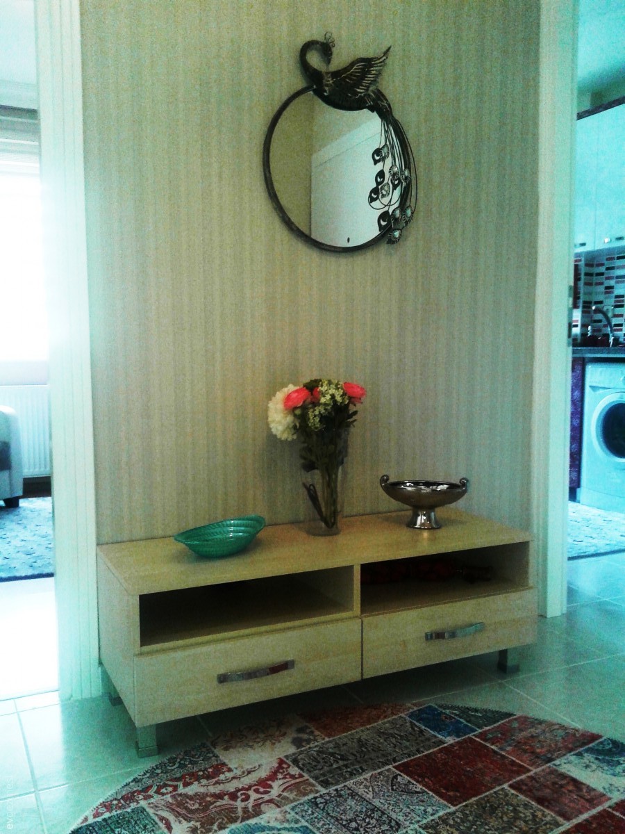 Duvardaki ayna eskiden boy aynası idi. :) Çivi aparatlarını söküp yatay olarak taktım. Şimdi masa üstünde daha dekoratif oldu.
