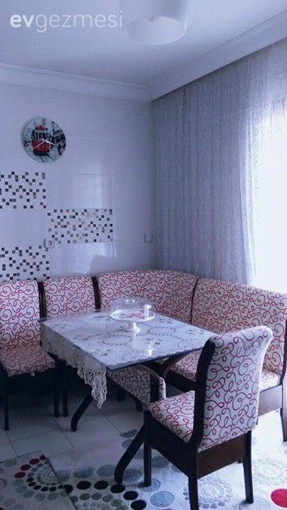 Cam sehpalar konusunda değişim yerinde olabilir..ayrica mutfakta haliyi duz renk kullanmaya ne dersiniz? Kose takımı desenli, fayanslar desenli, hali da desenli..en kolayi haliyi düz renk kullanmak olur sanirim..herşeyiniz pırıl pırıl..maşallah..guzel gunlerde kullaniniz..