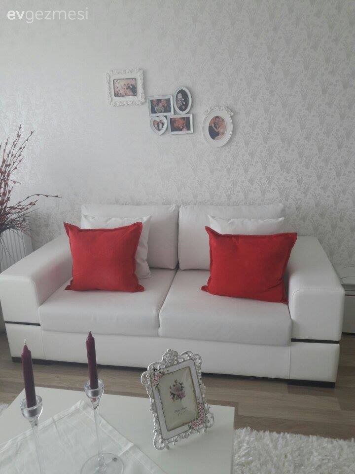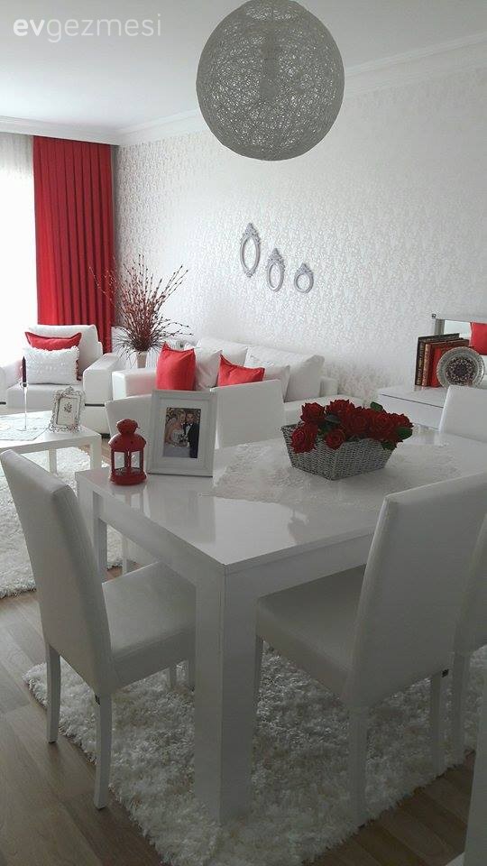 140 metrekarelik evlerinde, sade hatlı modern stil mobilya tercihlerini genelde beyaz renkten yana kullanan ev sahibimiz, fazla beyaz renkle oluşabilecek monoton görünümü iddialı renk kırmızı renk ile aşmış.. Salonunda aksesuarları, fon perdeleri, minder ve çiçeklerinde göz alıcı bir kırmızı tonuna yer veren Merve hanım desenli kumaşlar yerine düz renkler kullanarak şık ve cesur bir görünüm yakalamış..