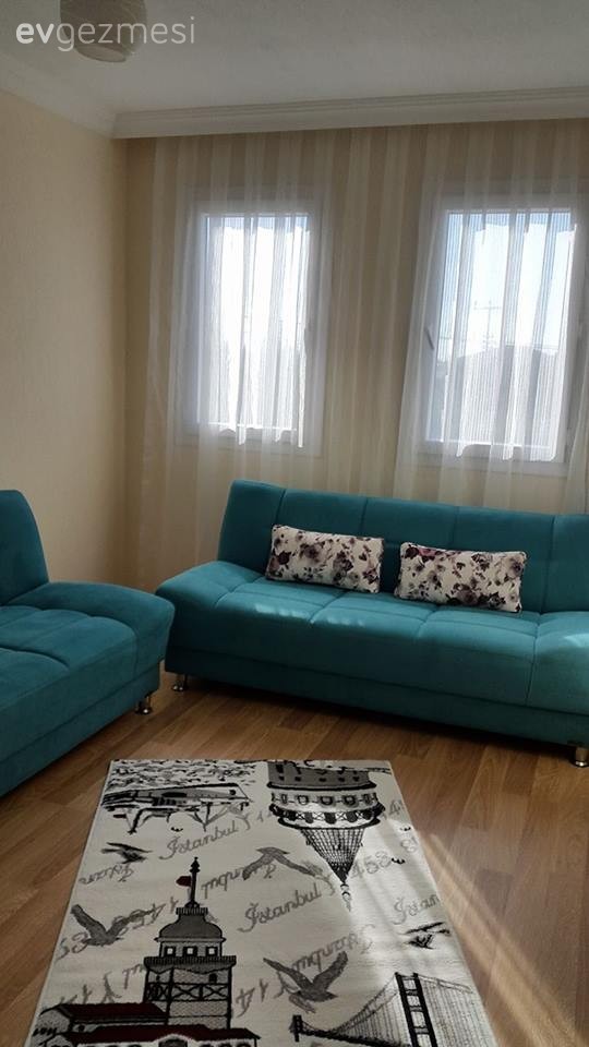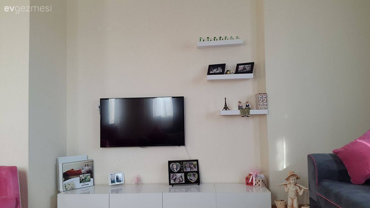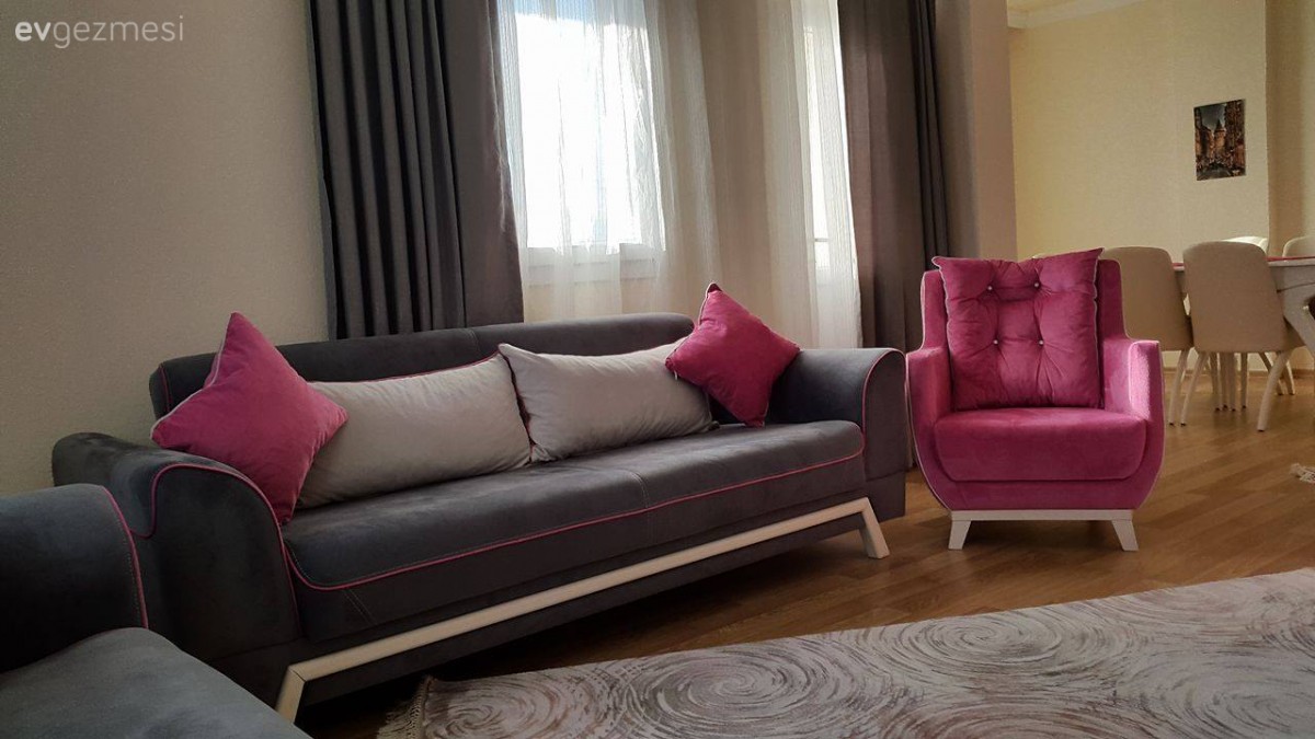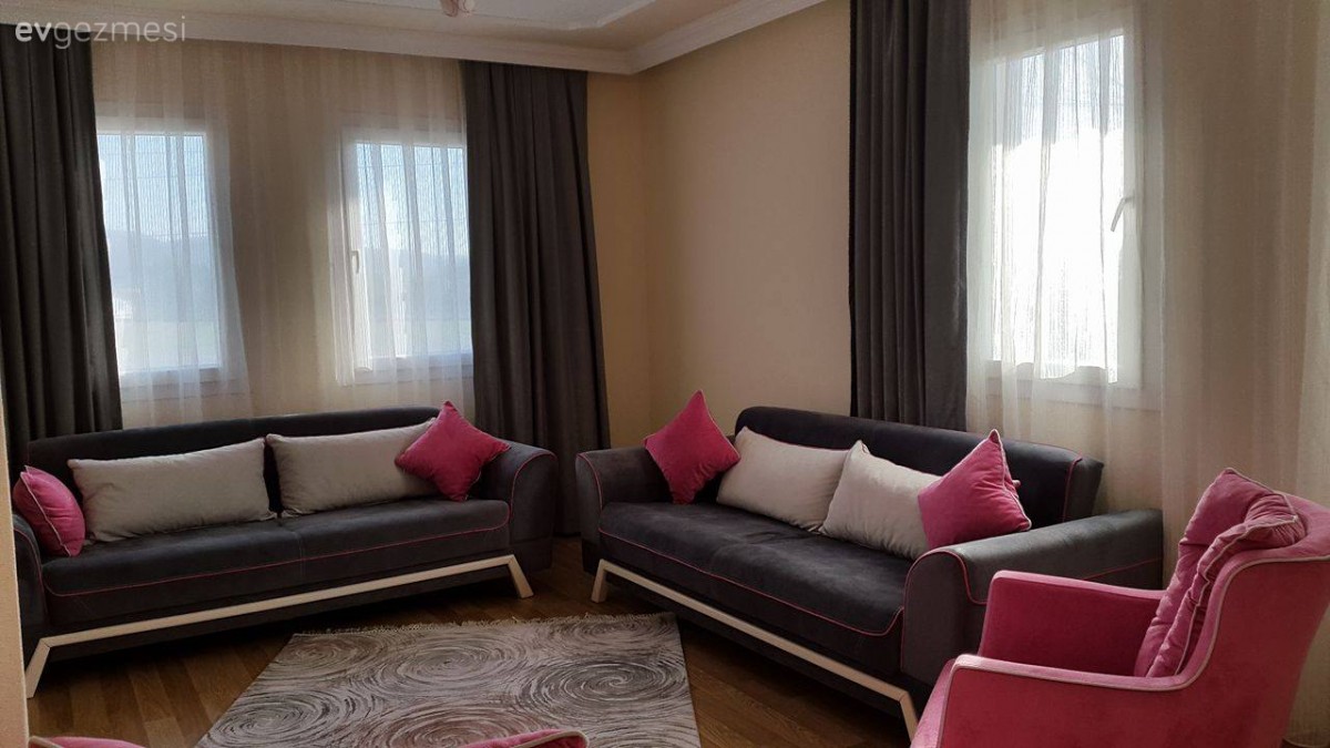 Fonlar gri degil de baska bir renk olsa cok daha iyi dururdu sanirim. Koltuklar desensiz oldugu icin cok goz yormayan bir desen, kendinden desenli yahut 2 renk (mesela pembe ve krem) fon secilebilirdi. Ufak caminizda tek kanat var, onu 2 ye tamamlayin. TV unitesi raflari yuksek kalmis, biraz alcaltip ust uste gelecek sekilde konumlandirilsa goze daha hos gorunur diye dusunuyorum. Bir de capraz hali olayini asla anlayamayacagim sanirim.
