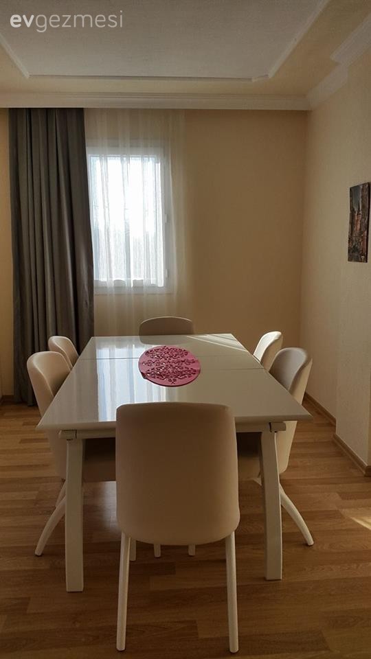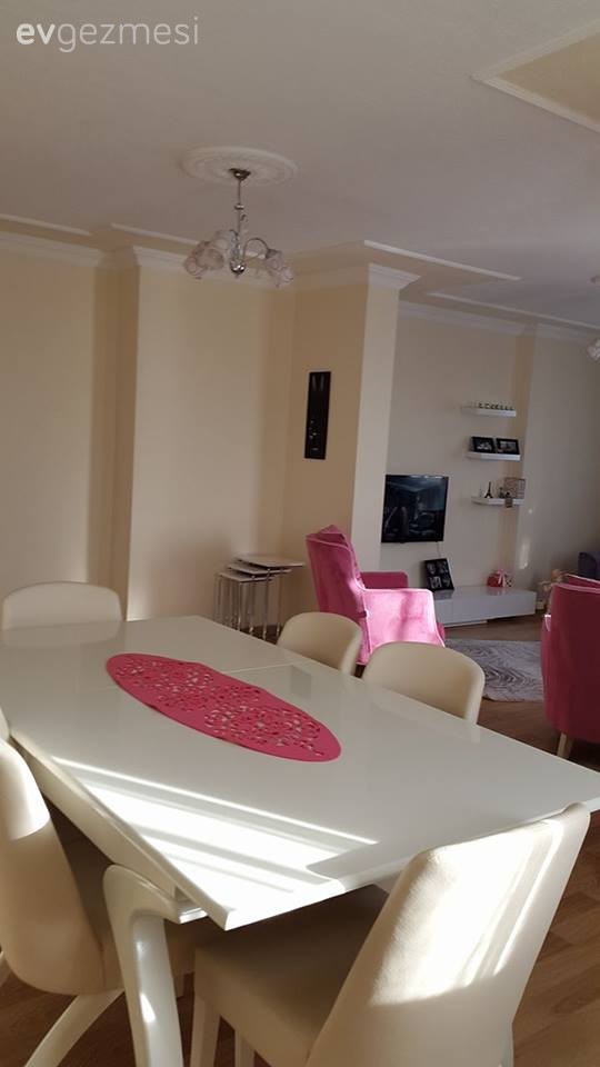 Aklıma gelen birkaç fikir:<br /> - Tv bölümünün duvar rengi kum beji gibi bir şey galiba, mobilya ayaklar ve ünite beyaz o bölümde beyaz renk kullanma imkanınız varsa çok hoş olur. Yemek bölümünün bir duvarında krem renk sandalyelerinize uyum sağlar.<br /> - Duvar dekorlarınızı biraz zayıf buldum, daha büyük boyutlu tablolar veya posterler çok daha değiştirecek havanızı. Aynı şekilde yemek bölümünde bir duvara duvar kağıdı olabilir.<br /> - Zigon sehpalarınız dekora çok uymamış, renkli sehpalar var fiyatlar da çok uygun internetten bakabilirsiniz.<br /> - Halı düz çok daha iyi olur. Evin neredeyse tamamı çapraz.<br /> - Bir de son olarak fon perdenizi kenardan tutturacak bir şey alırsanız çok daha iyi görünecek eminim.