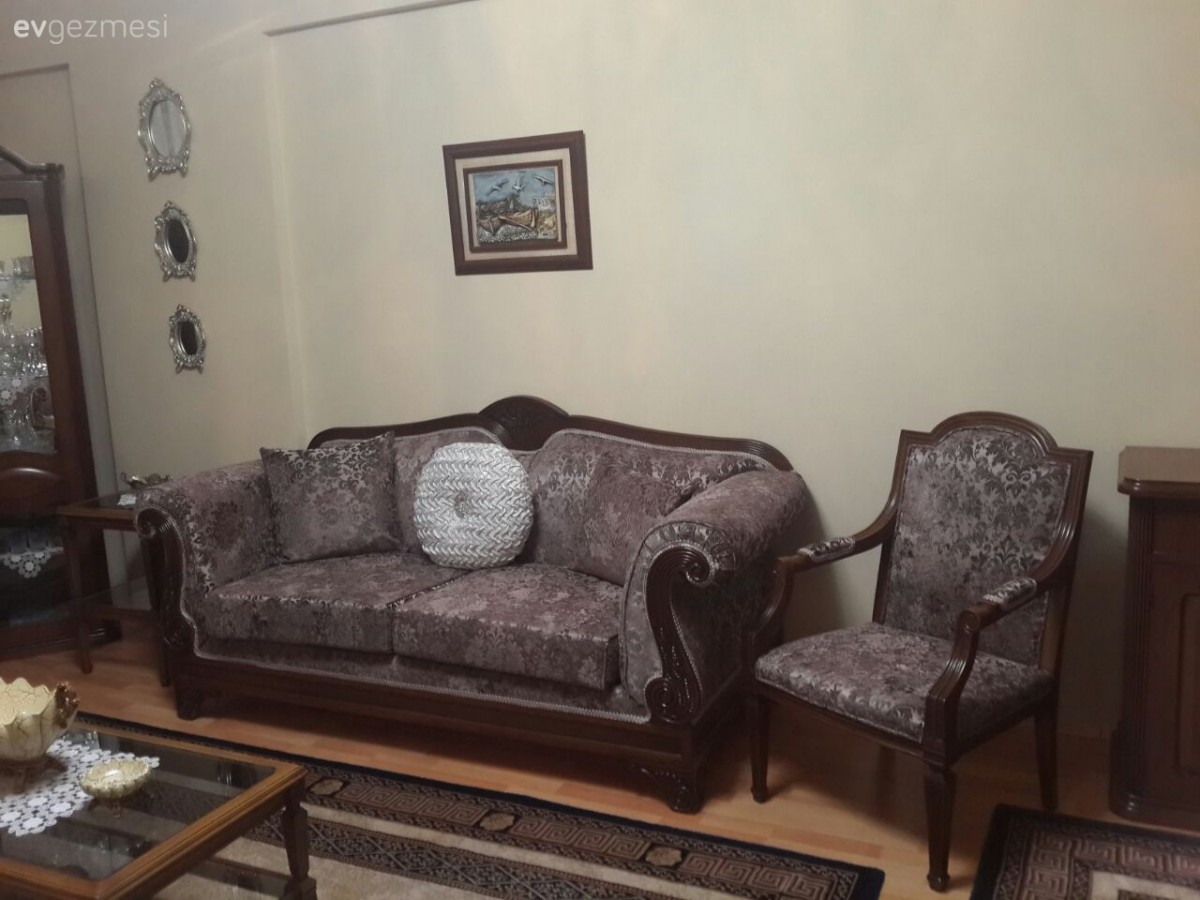 Sema Hanim masallah 16 yila ragmen dosemeleriniz dahil yep yeni gorunuyor. Diger arkadaslara katiliyorum eger mumkunse koltuklari ve sandalyeleri acik renk bir kumas ile kaplatirsaniz harika olur. Kahverengi mobilyaya yesil veya mavi tonlari cok yakisiyor. Krem rengi de olur. Eger dosemeler degisecekse, koltuklarin sirt kisimlari duz kumastan, oturulacak minderler ise kendinden desenli kumastan kaplanabilir. Komple desenli kumas biraz goz yorucu duruyor. Aslinda damask cok seviyorum, koltuk kumasinizi begendim ama rengi farkli olsa ve dedigim gibi komple desenli olmasa daha hos dururdu diye dusunuyorum. Eger doseme degistirme imkaniniz yoksa bu durumda kirlentlere kilif diktirebilrisiniz. Yuvarlak kirlentlerin kumasi cok alakasiz duruyor. Bir de berjerlere yuvarlak kirlent yerine dikdortgen sirt yastigi koyarsaniz daha hos gozukur. Masanizi kesinlikle degistirmeyin, oval masalari cok seviyorum. Masanin uzerindeki vazo cok yuksek duruyor, onun yerine orta sehpa uzerindeki gondolu koyabilrisiniz. Esya yerlesiminde biraz degisiklik iyi olabilir, farkli kombinasyonlar deneyin. Uclunun birini pencerenin onune almak iyi bir fikir olabilir. Vitrinlerin boyutu farkli oldugu icin ikisi ayni duvarin koselerinde olmamis sanki. Ayni boy olsalar guzel bir simetri olurdu ama daha iyi bir yer bulunabilir sanirim. Konsolun aynasini cikarip yerine oval buyukce bir ayna asabilirsiniz, yahut klasik cerceveli kocaman bir tablo. Halilar kesinlikle degismeli. Cok hareketli olmayan cok acik renk bir hali secin, kendinden desenli krem bir hali olabilir. Odanin havasini cok degistirecegini dusunuyorum. Koridordaki aynaya bayildim, nereden ne kadara aldiginizi ogrenebilir miyim?