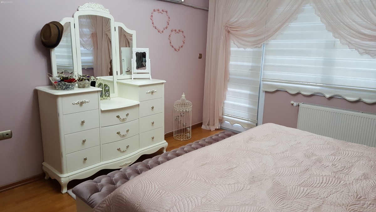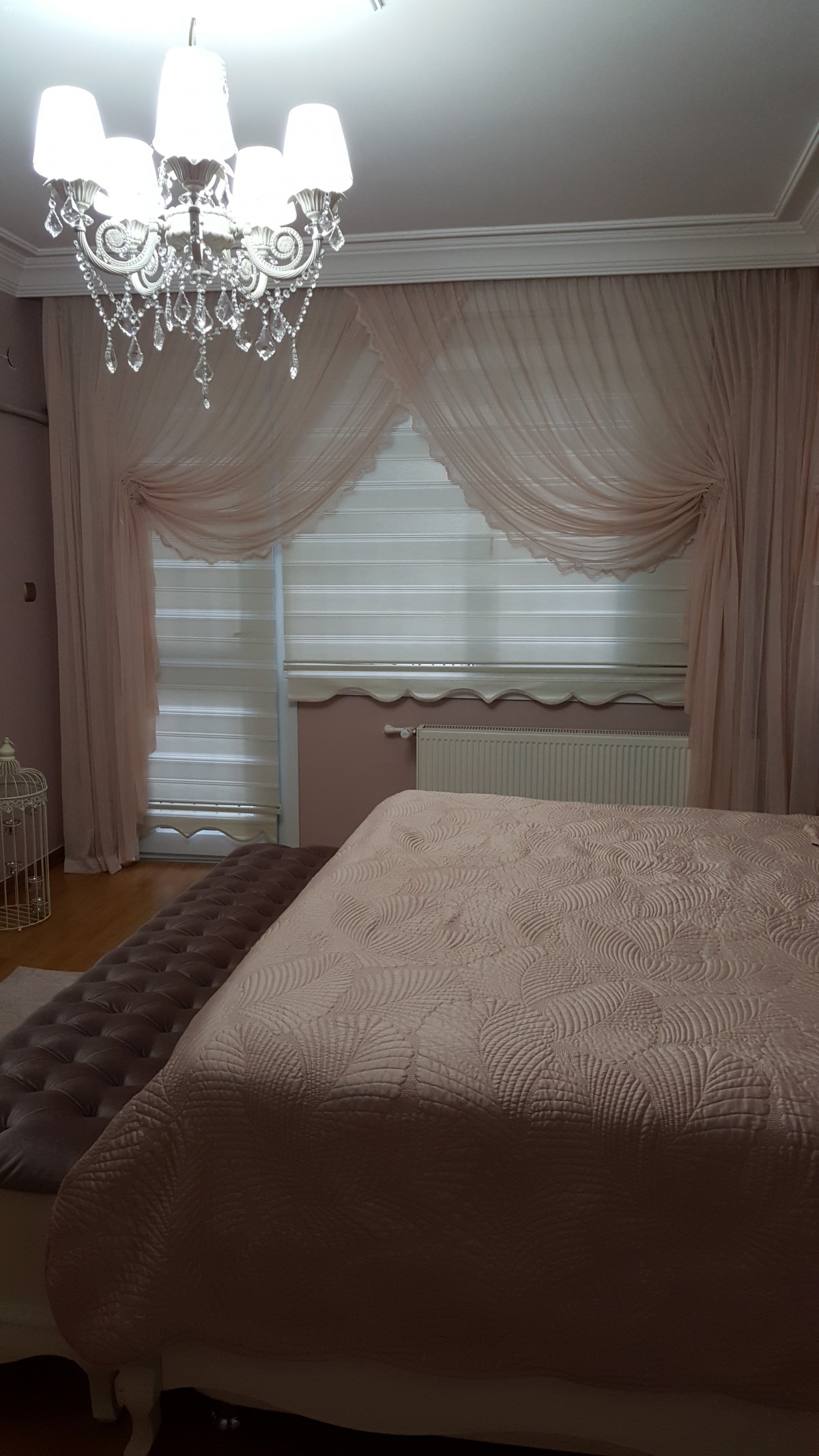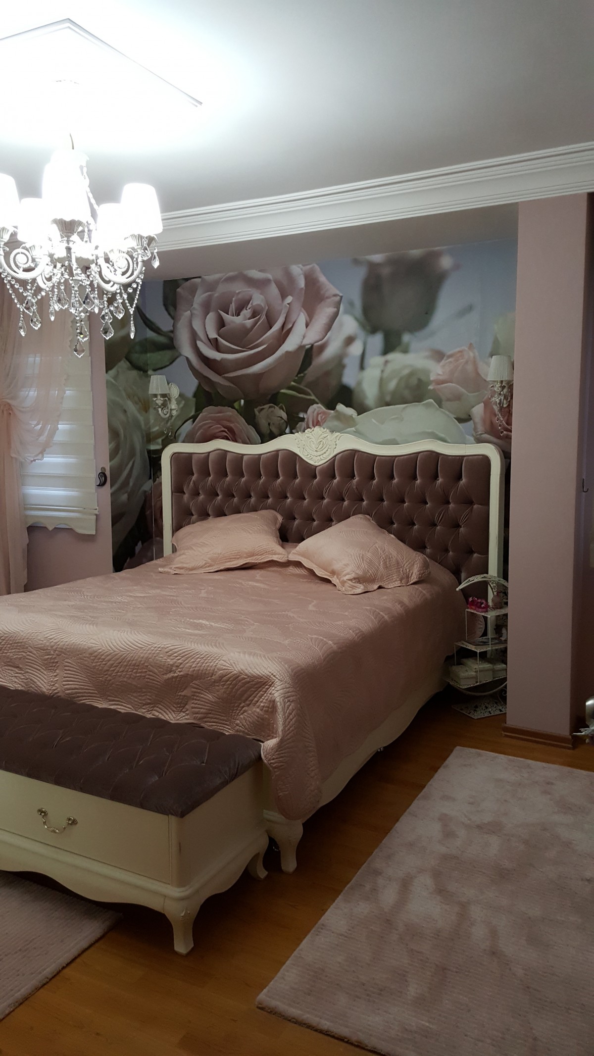 Oğlumun doğumuyla değiştirdiğim yatak odamı 2 senelik emek sonunda istediğim duruma getirdim yatak puf ve sifonyer ısmarlama olarak yapıldı sifonyeri internette begenip birebir aynısını yaptırdım.yatak başının arkasına yaptırdığım 3 boyutlu duvar kağıdı ile odaya biraz neşe katmak istedim.yatagi koydugumuz 2 kolon arasina olculer tutmadigi icin komidin yaptırmadıyaptırmadım ferforje dekoratif bir raf koymayı tercih ettim.avize ve aplikler 2.kez değişince icime sindi.duvarlara dekoratif kalp seklinde ferforje objeler koyarak biraz hareketlendirdim.sonucta istediğim gibi cıvıl cıvıl pembiş bir yatak odası oldu.
