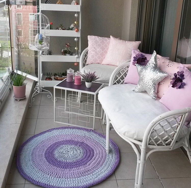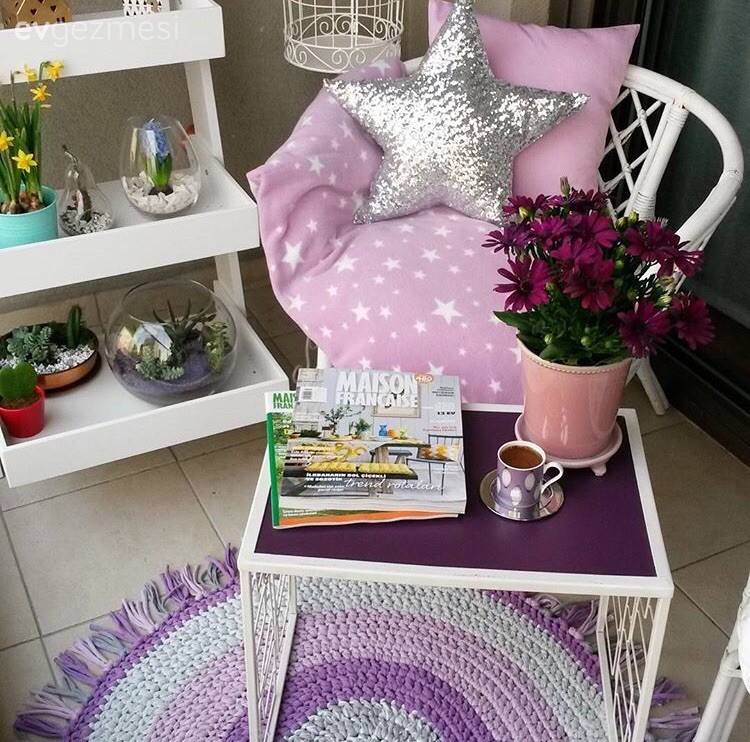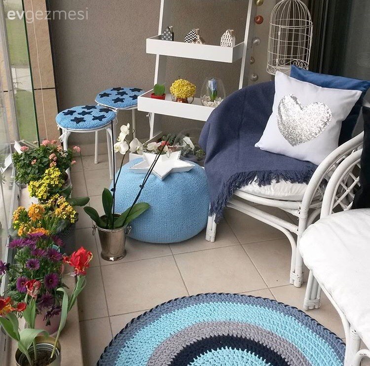 Griler pembe, mor ve mavilere yerini bırakmış; sukulentler renkli çiçeklere yerini kaptırmaya başlamış. Paspaslar kendi emeği; penye ip, 9 nolu tığ kullanılarak trabzan şeklinde yapılmış. Tanesi 3 saat gibi bir zaman da almış. Gezi sonu Ayşegül hanımın balkonu ve evinin daha önceki dekorlarına da göz atmayı unutmayın. Buyrun konuk olalım..