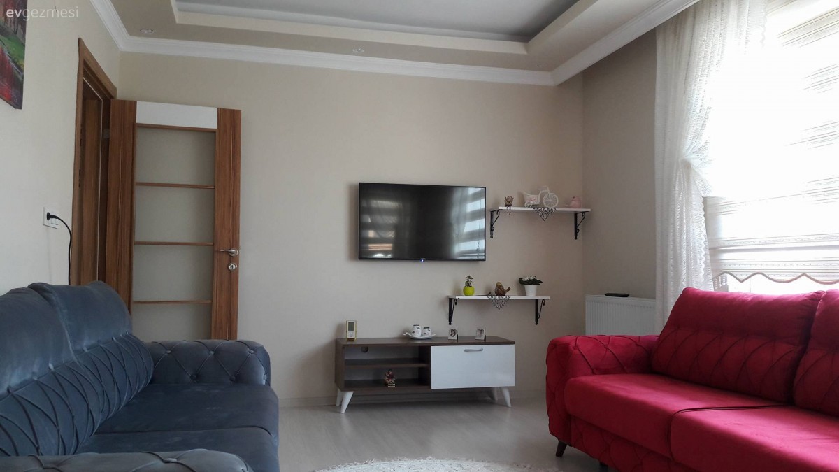 sevim hanım öncelikle evinizde güle güle oturun. benim gözüme akılan şey televizyonun çok yüksekte olması oldu. bence televizyonu daha aşağı alın