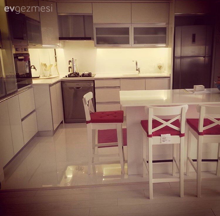 Duygu hanımın salona açılan Amerikan mutfağında modern çizgide, sade bir dekor tercih edilmiş..