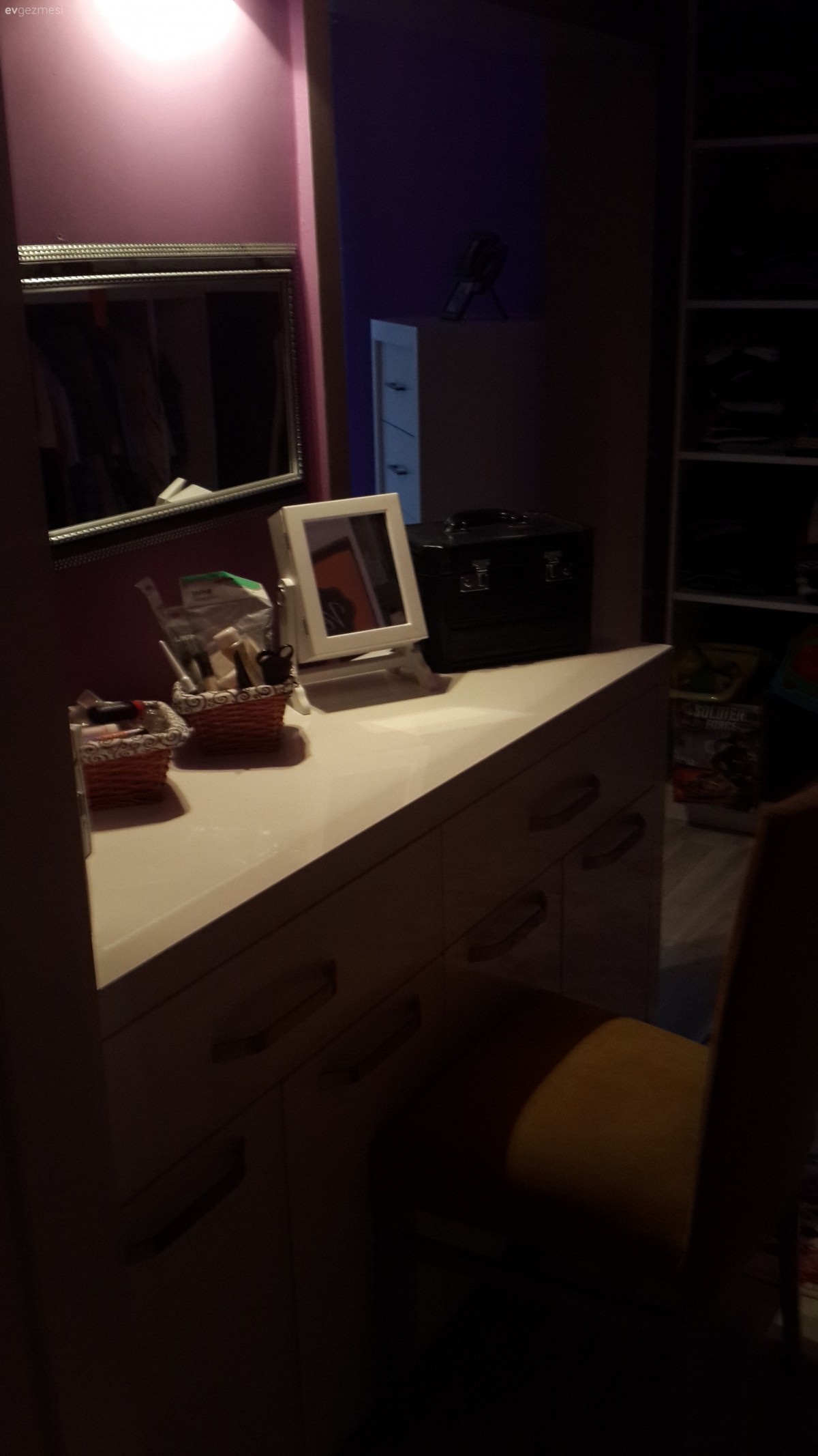 Bayıldım evinize. Küçük bir öneri olarak giyinme odası için bir perde yapabilirsiniz. Hem de arada dağınık olursa gizlenir. Çok hoş oluyor daha önce görmüştüm. Güle güle oturun.