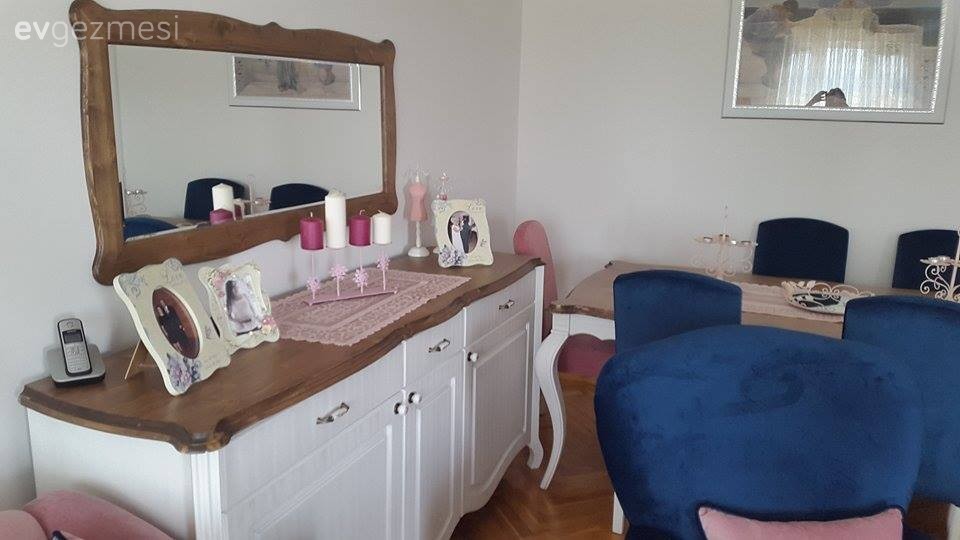 Biz başlamak isteriz. Mobilyalarda kullanılan lacivert renk, pembe koltuklarla ve halıyla çok güzel bir uyum sağlamış. Birkaç yer değişikliği ile dekorasyon çok daha da bütün olabilir diye düşünüyoruz. Daha önce burada önerilmiş olan berjerlerin cam önüne alınması ile Beyza Hanım'ın berjerleri tamamen şekil değiştirmişti. Berjerler cam önüne alınıp, sehpalar ortasına alınabilir, bu çok daha ferah bir görünüm verecektir. 2'li koltuğunuzu da berjerlerin yerine alıp, yemek odası ve oturma alanı birbirinden ayrı bir görünüm kazanır, hem de yemek sandalyeleri ve pembe koltuk uyumu yakalanır. Çok zevkli eviniz, güle güle eskitin yeni eşyalarınızı :)