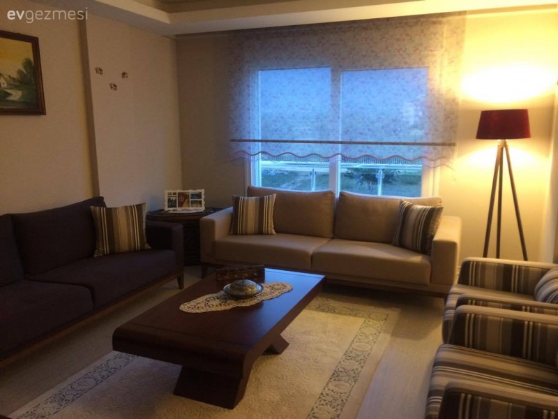 Yeni evli ev sahibimiz, açık renkli koltuklarını kahverengi bir patchwork el dokuma halı ve rustik perdelerle tamamlamış. Aksesuarlar ise değişken; bazen minder, koltuk şalı gibi detaylar renkli, bazen ise naturel tonlarda bir ortam oluşturuyor.. Aksesuarlar H&M Home ve Zara Home ağırlıklı tercih edilmiş; mobilyalar ise İnegöl'de özel yaptırılmış.