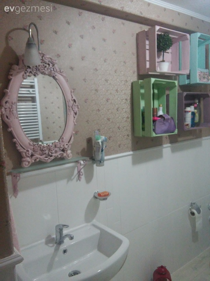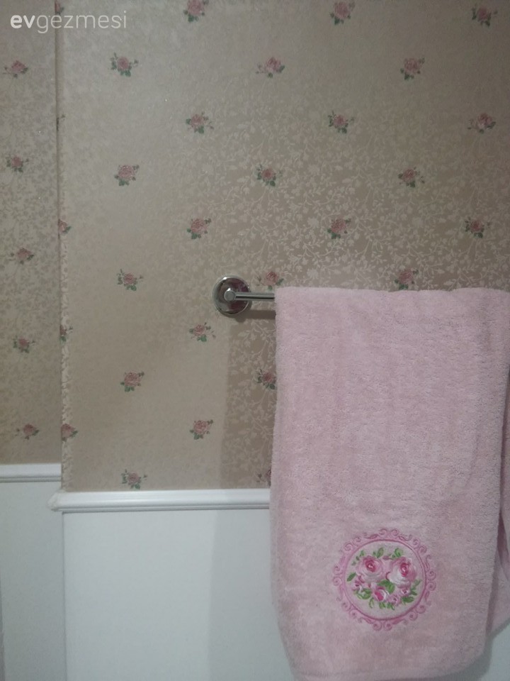 duvar kağıdı uygulamasını cidden çok başarılı ve hoş buldum... emeğinize sağlık... benim gözüme iyi görünmeyen tek şey aynanız... beyaz ve toprak tonları hakim banyonuzda keşke ayna da beyaz olsaydı... beyaz çerçeveli, biraz daha büyük, oval sade bir ayna çok şık dururdu diyorum... emeğinize sağlık güle güle oturun...