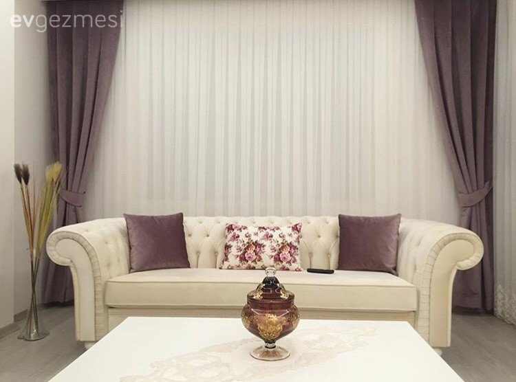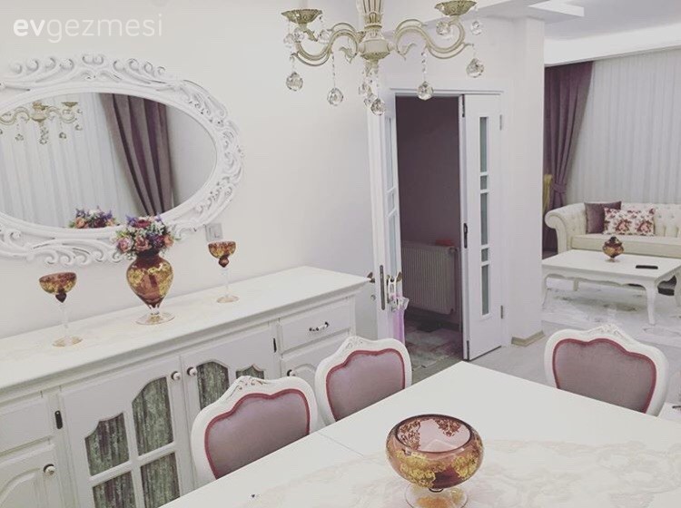 Klasik mobilyalarını mor ve beyaz renklerde tercih eden ev sahibimiz, altın detaylarla alana sofistike bir hava katmış. Perde, aksesuar ve aydınlatmalar stili başarı ile tamamlıyor. Mobilyalar Maltepe Mahir Mobilya'dan.