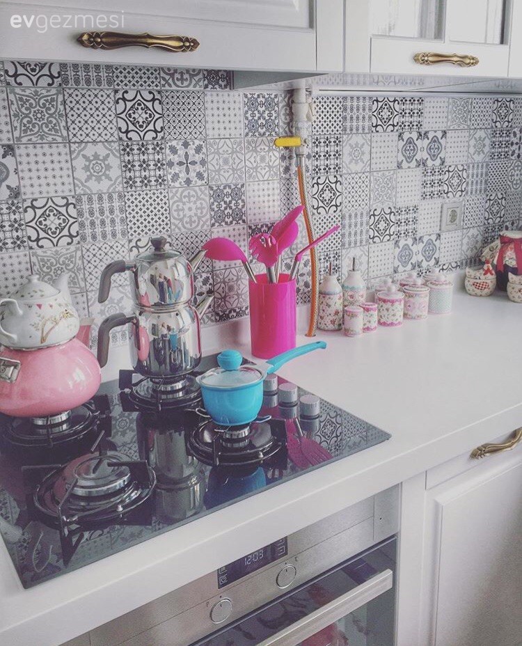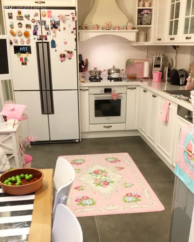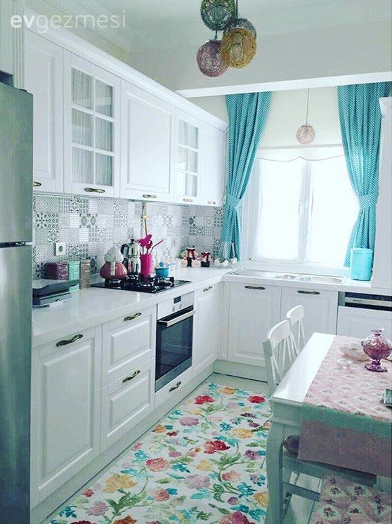 Mutfak, evlerinin en uğraştırıcı bölümü olsa da, şimdi sonuçtan çok mutlu ev sahibimiz. Country esintili beyaz mutfak, mavi vurgusuyla dingin ve enerjik görünüm kazanmış. Tezgah arası seramikleri ile hareket katıyor. Mutfak halısı Angora halı, tezgah arası ise Yurtbay Seramik Zen serisi. Buyrun konuk olalım..