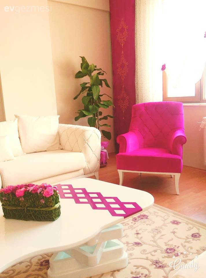Gamze hanımın küçük alanda tatlı ve kullanışlı bir dekor elde ettiği cıvıl cıvıl evinin konuğuyuz. Pastel renkler ve çiçek desenleri kullanmayı çok seven Gamze hanım, ana renkte seçtiği pembeyi beyaz ve yeşil ile dengelemiş.