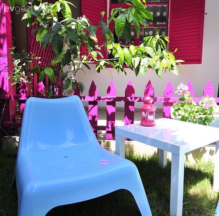 Küçük bir bahçeye de sahip bu tatlı ev, pembe, mor dış cephe detayları, yine aynı renklerde çit, panjur ve verandası, bir de bunlara eşlik eden begonvilleriyle fotoğraflarına bakarken bile insanı neşelendirir görünümde.. Buyrun konuk olalım..