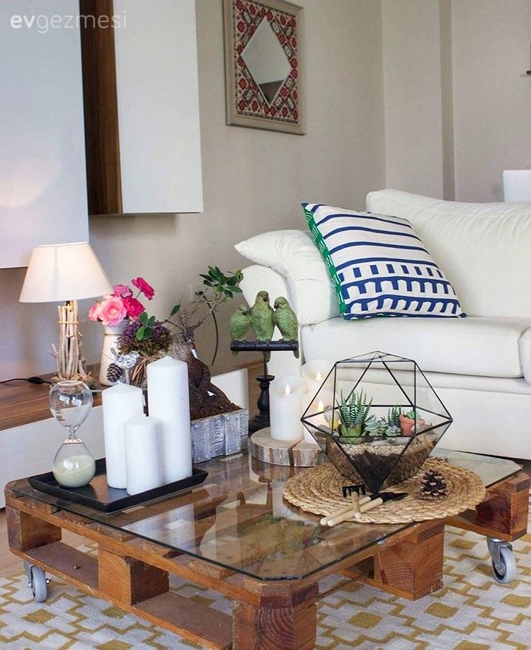 Sunum tahtalarından süslü kapı önü tabelaları, eski at arabası tekerinden dekoratif obje, atıl raflardan çiçek rafı ve hepsi aynı renge boyanan saksıların yanında oturma grubu bile el emeği; ev sahibimiz eski paletleri boyayıp, üzerine minder dikerek kendileri yapmış.