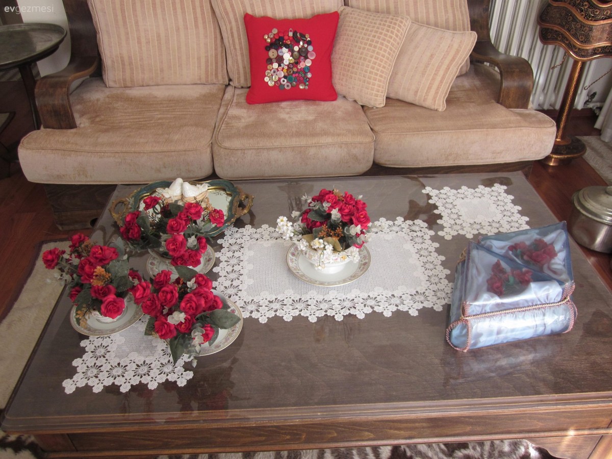 Birbirinin aynısı olan ruhsuz evlerden sonra yaşanmışlık duygusu veren değişik bir tarz . Objelerin çoğu bana tanıdık geldi ,çocukluğumu hatırlattı. Babaannemden anneannemden kalan hatıraları toparlayıp düzelersem ben de evimin her yerini olmasa da bir köşesini bu tarz yaparım diye düşünmeye başladım . kaneviçe örtüler, havanlar, tesbihler , kap kacaklar... eskiciler gibi ordan burdan toplamadıysanız, ailenizden kalma eşyalarsa gerçekten çok değerli oluyor. <br /> Masa üstündeki şapka ve ayakkabı yere yakın bir yerde durursa daha iyi olur gibi geldi .<br /> iyi günlerde kullanın .