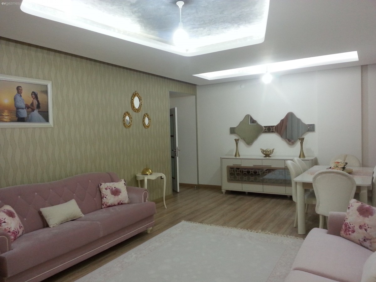 Nursedef hanımcım merhabalar. Bütün fotoğraflarınıza baktım. Salonunuzda ilk gözüme çarpan bu kadar tatlı pembe bir salona yakışmayan o duvar kağıdı. Mümkünse şayet o duvar kağıdını çıkarmanızı öneririm. Cama çok yakın olan berjerleri ve diğer koltuklarıda birbirinden biraz daha uzaklaştırırsanız mekandaki boşluk hissi gidecektir. Bir diğer nokta ise insan boyunu geçen yükseklikte asılı olan çerçeve ve aynalar. Eşinizle fotoğrafınız çok güzel (Allah her daim mutlu etsin dilerim). Lakin duvara asmak yerine konsolunuzun üzerindeki klasik altın objeleri alıp yerine kendi resimlerini koyabilirsiniz. Krem rengi sanırım masanız buna uygun sade bir orta sehpa kullanabilirsiniz. Duvarlarınız için büyüklü küçüklü çerçeveler, asılabilen anahtar vs. değişik objelerle salonunuza dahada hareket katabilirsiniz.<br />