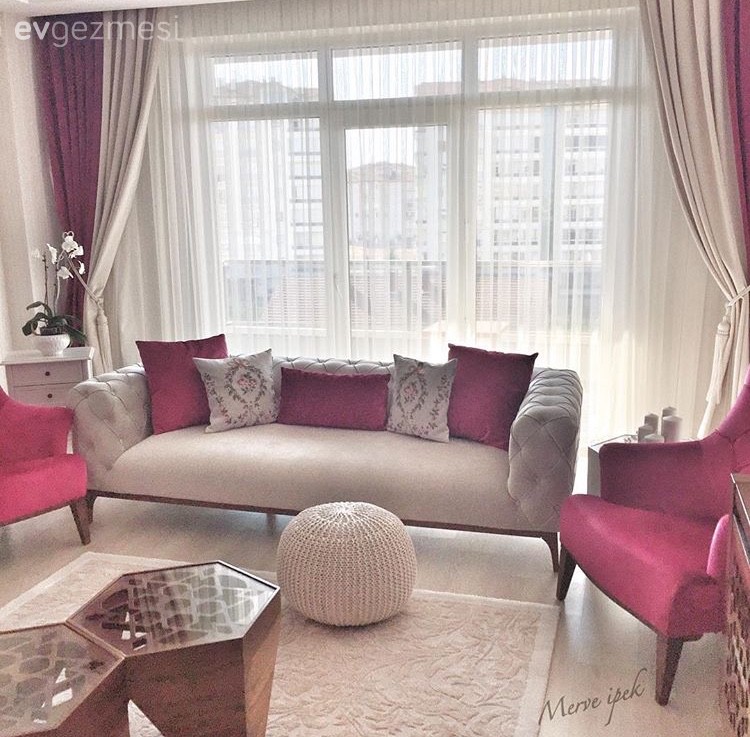 Pembe, yeşil renkli seçimlerini beyaz mobilyalarla dengeleyen Gülşah hanım, mobilyalarında ince hatlı, country stil esintili parçalar tercih etmiş. Salonda kullandığı runner'lardan, vitrin içi örtülerine, konsol ve orta sehpa üzerinde kullandığı dekoratif kaselere ve saate kadar uyumu yakalamak için çaba gösteren ev sahibimiz, renkli ve cıvıl cıvıl bir atmosfer yakalamış. Buyrun konuk olalım..