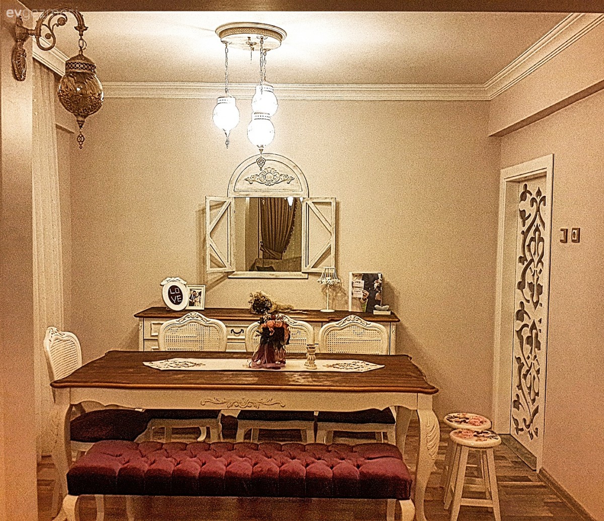 Koltuklari ve fonlari cok begendim yemek odasi mutfak mutfak masasi avize de çok güzel renkli zigonlari kaldirin evinizin tadini cikarin