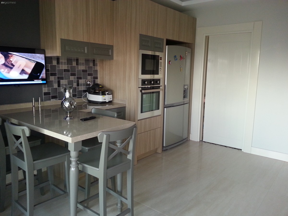 Evinizin dekoru ayrı hoş, genişliği ayrı hoş. Mutfaktaki tasarımı çok beğendim. Bar tabureleri ikea'dan alıp boyadınız mı yoksa?