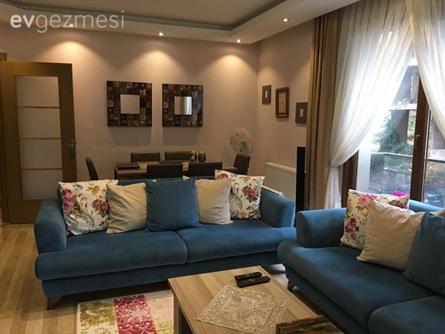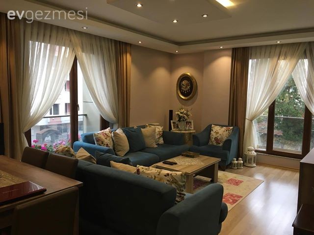 Salon mobilyaları 5 yıl önce değiştiği için yenilere ihtiyaç duyulmamış. Perdeler ise Neslihan hanımın elinden geçme. Eskiden 2 kanat olan fonlar 2'ye bölünerek 4 kanat elde edilmiş; tüller bu odaya uygun kesilmiş.
