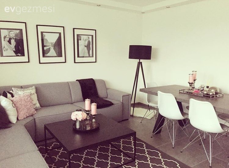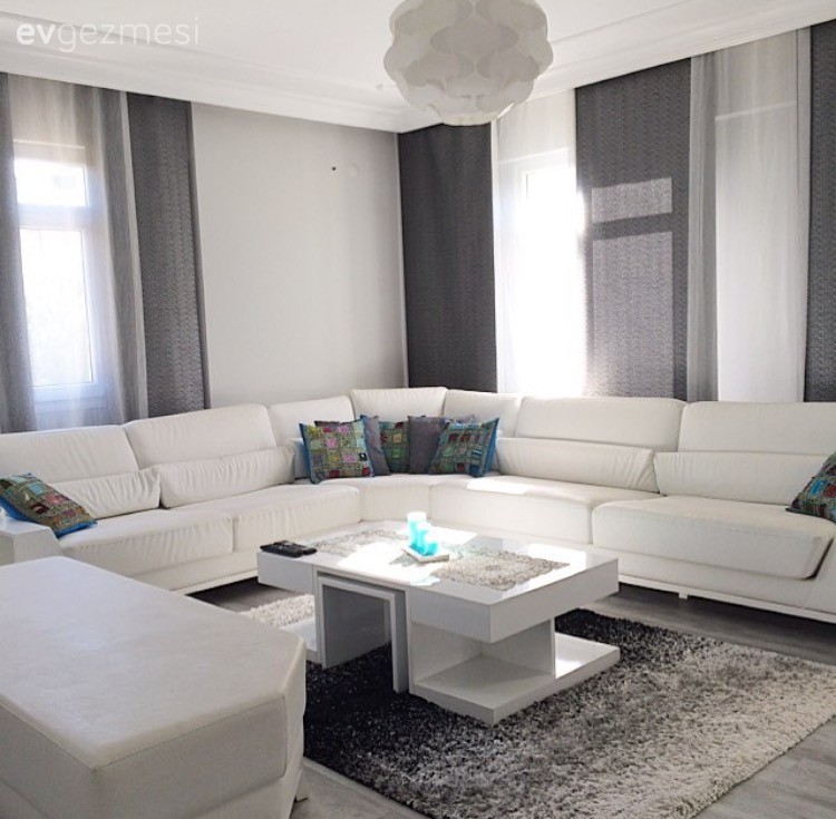 Serin renklerin dinginliğine evinde yer veren ev sahibimiz, neredeyse tamamı beyaz mobilyalarını gri renk duvar ile ön plana çıkarmış. Buyrun konuk olalım..