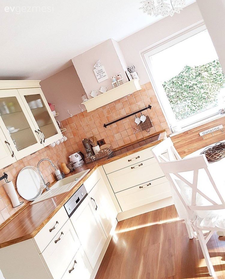 Aytül hanımın country esintilerle dekore ettiği mutfağı ve mutfağın açıldığı oturma odası, pembe ve mavi renkleri ile cıvıl cıvıl bir görünümde.. Buyrun konuk olalım..
