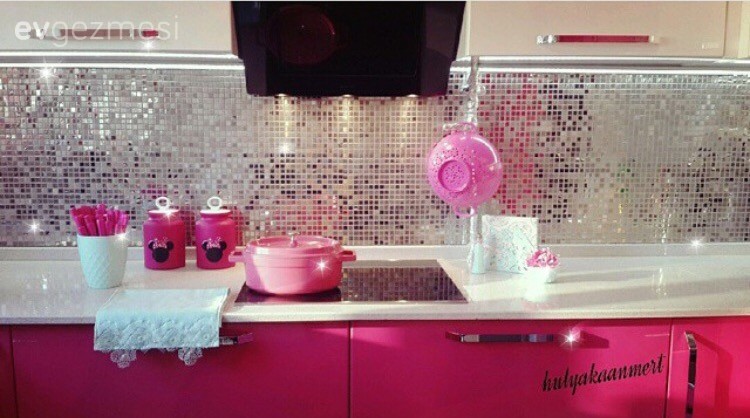 Hülya hanımın rengini çok sevdiği bir eşyasını götürüp, tam da bu tonu istiyorum diyerek yaptırdığı pembe ve beyaz, iki renkli mutfağı, tatlı renklerine şıklık katan tezgah arası taşları ve siyah, cam ankastreleriyle göz alıcı bir görünümde..