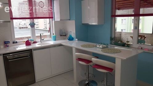 Dolaplar, tezgah, tezgah arası ve ankastrelerde tercih edilen beyaz, renkli mutfak aletleri, mavi duvar rengi ve pembe perdeler ile tamamlanmış. Buyrun konuk olalım..