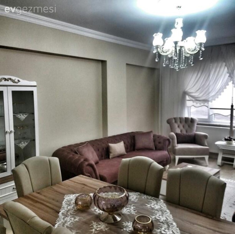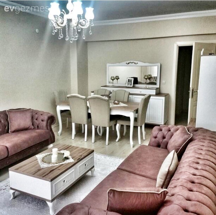 Özge hanımın simetrik yerleşimi tercih ettiği salonu, toprak renklere eşlik eden ahşap ve beyaz zarif mobilyalarıyla abartıdan uzak ve sıcak bir görünümde.. Buyrun konuk olalım..