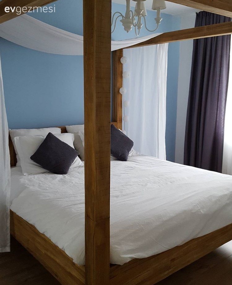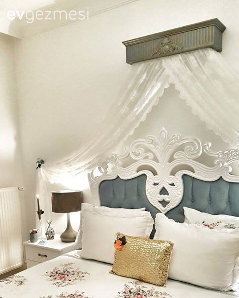 Bahar hanım, yataktan bağımsız şekilde duvarda rustiklere astığı tüllerle, cibinlik görünümü yakalamış..