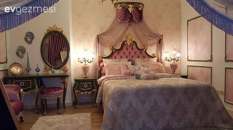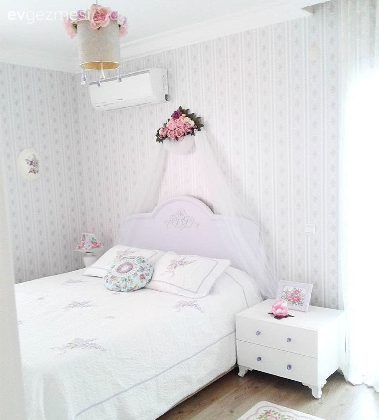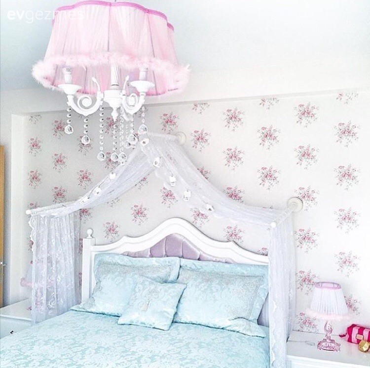 Avize, duvar kağıdı ve cibinlik; her detay odanın tatlı havasıyla uyum içinde..