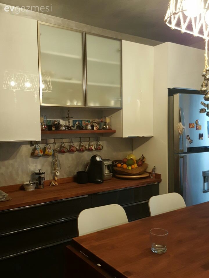 Yenilenen bu mutfakta, tasarım kadar, fonksiyoneliteye de odaklanılmış. Alan çok geniş değil; bu sebeple depolama ve tezgah alanı sağlayan mutfak adası, tekerlekli ve kilitli tercih edilerek, kullanım esnasında yer değiştirebiliyor. Ada, aynı zamanda yemek masası olarak kullanımda. Açılır tezgahı ile 4 kişinin oturmasına imkan sağlıyor.
