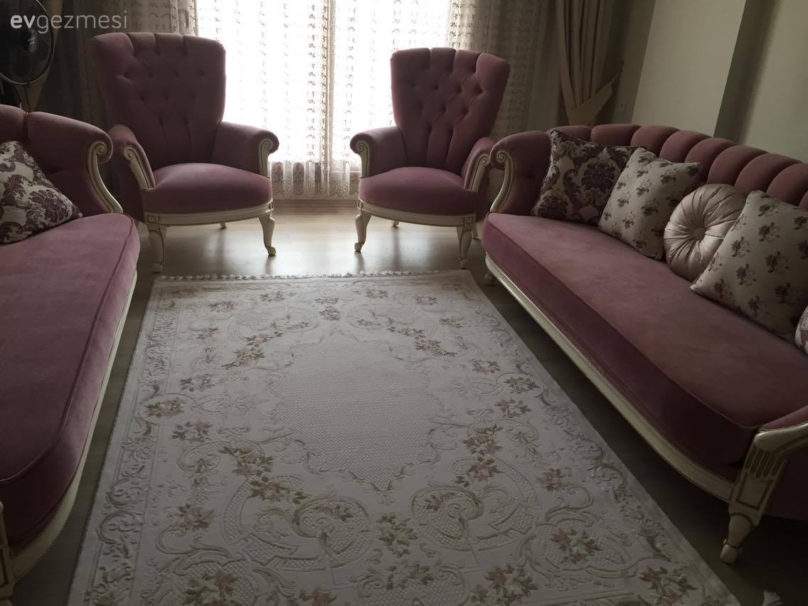 1. Resim acik renk hali..ve krem fon ekru düz tül ..zaten koltuklar gül kurusu renginde iyice bogmaya gerek yok ayni renkte fikrimce tabi..Karar Sizin güle güle oturun