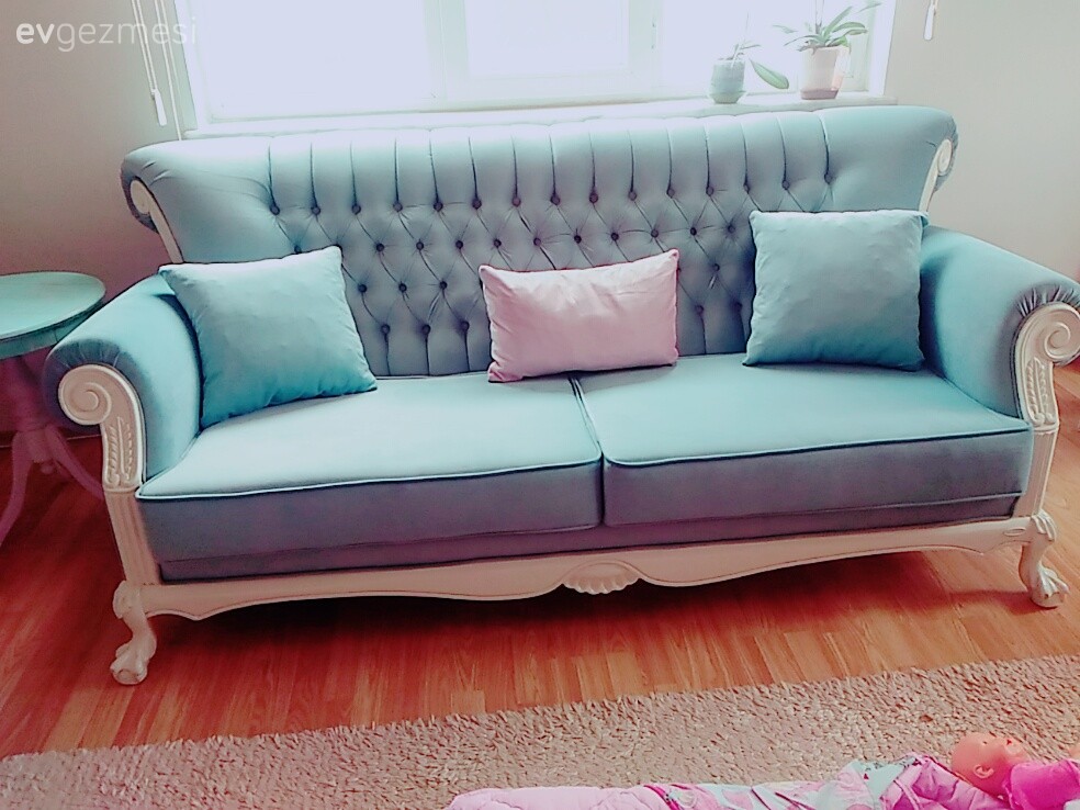 12 yıldır kullandığım koltuklarımı uzun süredir döşemesini değiştirmeyi düşünüyodu sonunda renklere karar verip yeniledik sandalyeler annemden 25 yıllık 2. yenilenmesi aklımda hiç mavi yokken bu sitedeki evlere baktıktan sonra mavi ve pembeye karar verdim iyikide vermişim çok içimize sindi sizinden yorumlarınızı merakla bekliyorum.....