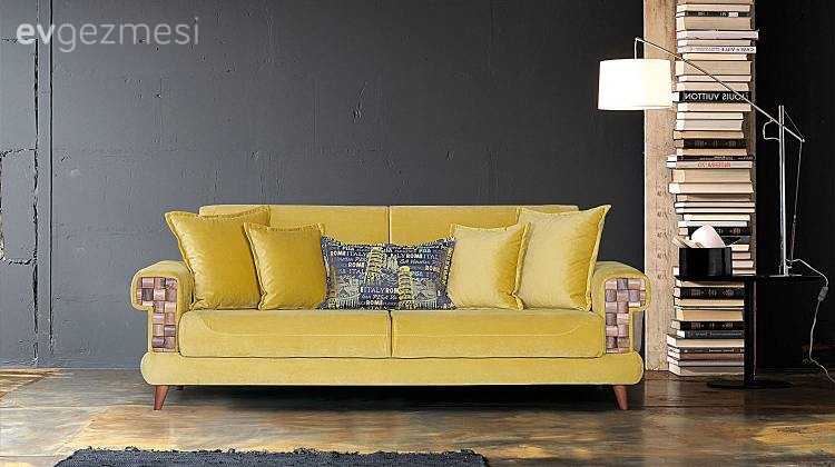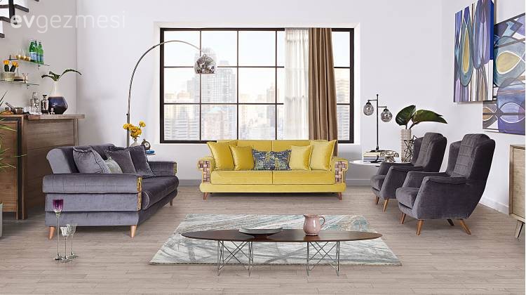 Madem kanatlar sarı, o halde halı ile aynı renk detaylı, ahşap ayaklı bir üniteye ne dersiniz? Ya da koyu renk koltukların çok açık bir tonu, yine ahşap ayaklı?<br />