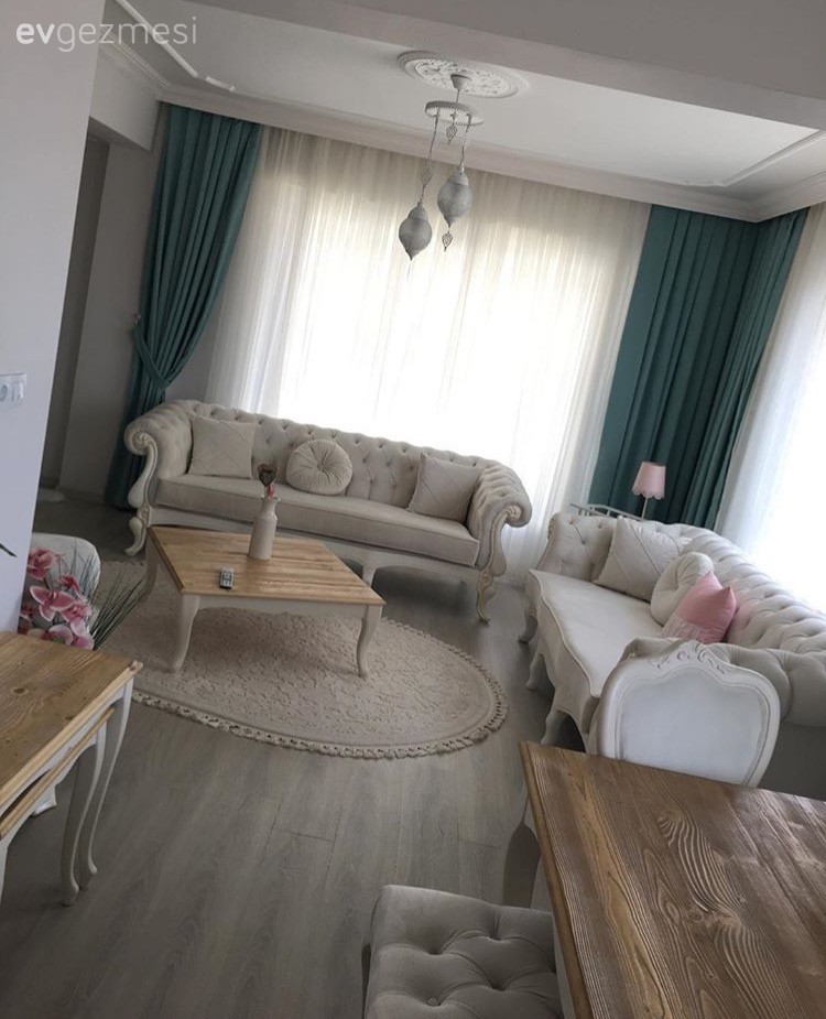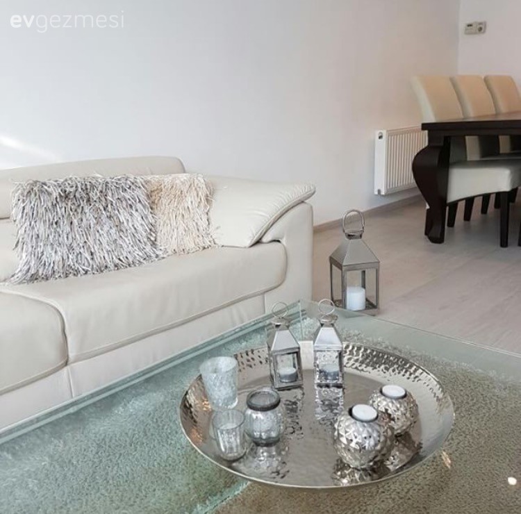 Almanya'da yaşayan Seval hanımın sade ve şık bir hava yakadığı evinde, tv ünitesi arka duvarında taş duvar ve şömine alana sıcaklık katarken, yemek bölümünde kullandığı ayna, gümüş aksesuar ve fenerler şık bir hava kazandırıyor. Pleksi orta sehpa ise, alanı daraltmayan, kullanışlı bir sehpa çözümü.