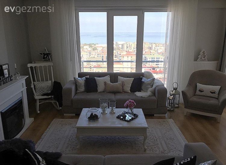 Açık mutfaklı salon ise beyazlara mavi dokunuşlarla canlanıyor. Serin renklerin hakim olduğu bu alan, dingin ve huzur verici bir görünüm kazanıyor. Buyrun konuk olalım..