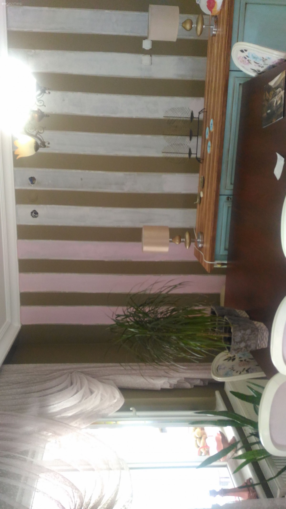 bu sitede gordugum bi uygulamayi ne zamandir uygulamayi dusunuyodum cizgili sekilde duvarimi boyadim 16 cm araliklarla seritler cektim duvarim cok koyuydu onun rengini yumusatmak adina pembe kullandin yorumlarinizi beklerim