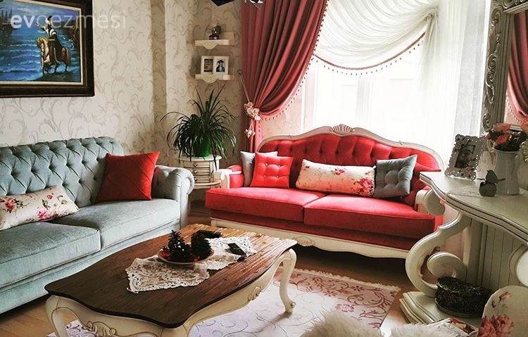 Salonda country stil bir takım tercih eden ev sahibimiz, dekoru renkli aksesuarlar, büyük boyutlu avizeler ve pembe, beyaz ve mint yeşilden oluşan renk paleti ile tamamlamış.