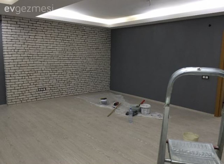 Salonlarında ilk seçtikleri ledlerle döşenmiş asma tavan ve avizeleri olmuş. Sonrasında duvar taş ile kaplanıp, Zeynep hanım ve eşi tasarından griye boyanmış. Duvar dekorunu zenginleştiren raf, sonradan duvara monte edilerek dekor tamamlanmış. Zeynep hanım, bu değişimlerin tamamını da fotoğraflamış. Buyrun konuk olalım.