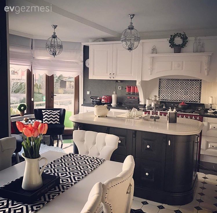 Mutfak dekoru ise, siyah ve beyaz, çift renkli parlak dolapları, geometrik desenli perdeleri ve stile uyumlu masa, sandalyeleriyle modern ve şık bir görünümde..